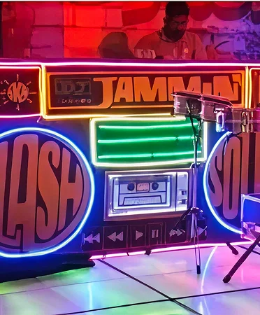 A vibrant, jungle-inspired wedding with neon lights, electric décor, and unforgettable energy.