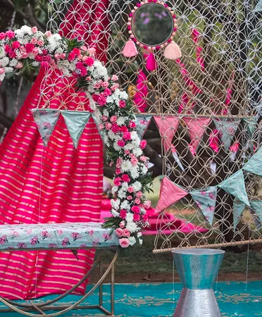 Uff Teri Nazar is a wedding theme for the bride who doesn’t just walk in — she makes an entrance. Inspired by iconic Bollywood romance, this concept is all about drama, flirtation, glam lighting, and over-the-top charm. It’s not a wedding… It's a blockbuster. From retro signage and neon quotes to glittering photo walls and diva-style vanity corners, every detail celebrates the inner superstar in you. It’s for the lovers who want more sass than subtlety and a celebration filled with flashbulbs, fun, and flair.